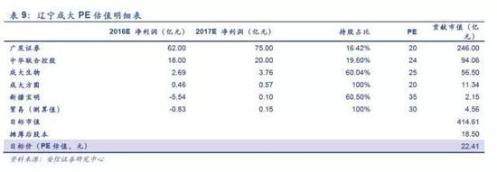 预计2017年广发证券贡献市值246亿元(20倍PE),中华联合控股贡献市值94亿元(24倍PE),成大生物贡献市值56.5亿元(25倍PE),成大方圆贡献市值11亿元(20倍PE),新疆宝明贡献市值2亿元(35倍PE),贸易方面贡献市值4.6亿元(30倍PE),公司目标市值414.6亿元,摊薄后股本18.5亿股,目标价22.41元。