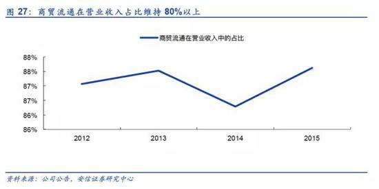 商贸流通是公司营业收入的重要组成部分。2012年以来商贸流通营业收入在公司总营业收入中的占比超过80%,是营业收入的主要组成部分,2016年上半年公司商贸流通营业收入达到32.94亿元,在营业收入中的占比为86.5%。