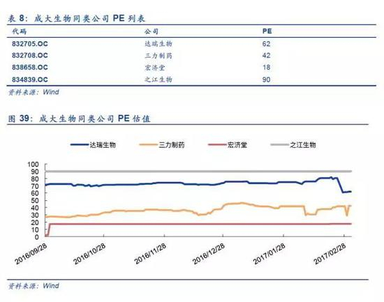 (3)成大生物:将成大生物与新三板市值相当的同类公司达瑞生物、三力制药、宏济堂、之江生物作对比,给成大生物25倍PE。
