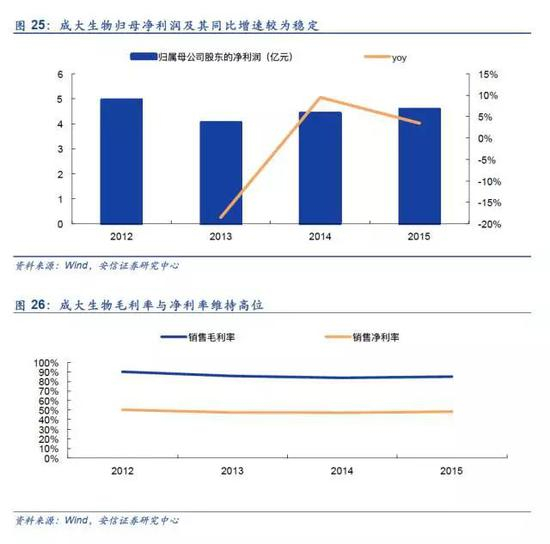 辽宁成大生物制药业务主要通过成大生物(辽宁成大子公司)开展。成大生物目前已挂牌新三板,其主要产品包括人用狂犬病疫苗(Vero细胞)、人用乙脑灭活疫苗(Vero细胞)及兽用狂犬病疫苗三类产品,2014年以来成大生物净利润实现稳定增长,毛利率与净利率维持约40%以上高位,2016年上半年成大生物人用狂犬病疫苗实现销售296万人份,同比增长2%,人用疫苗收入4.68亿元,占比99.94%,毛利4.01亿元,毛利率为85.59%,成大生物收入和利润同比保持稳定,实现销售收入4.69亿元,利润总额2.8亿元,山东疫苗事件的影响正在逐步消除,业绩整体较为稳定,预计2017年利润将与2016年基本持平。