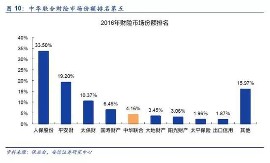 中华联合财险市场份额排名第五。2016年中华财险的财产险保费收入为385.9亿元,市场份额为4.16%,排名全国第五,仅次于A股上市的中国平安中国太保、中国人寿以及H股上市的中国人保的财险保费市场份额。