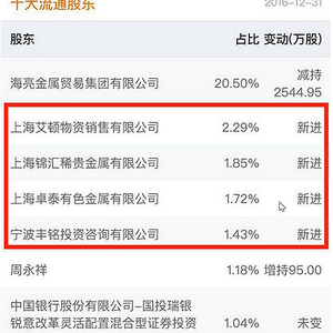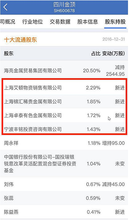 根据四川金顶发布的2016年年报,相较于去年第三季度,有四张“新面孔”整齐出现在该公司前十大流通股东名单之中,它们分别是上海艾顿物资销售有限公司(下称上海艾顿)、上海锦汇稀贵金属有限公司(下称上海锦汇)、上海卓泰有色金属有限公司(下称卓泰有色)、宁波丰铭投资咨询有限公司(下称宁波丰铭)。