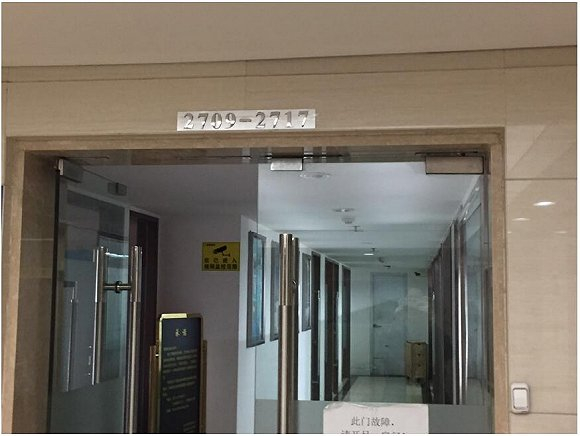物贸大厦前台工作人员向界面新闻介绍,大厦内共有A、B、C三座办公区域,27楼的B座与C座同属于海亮金属。到达27楼后,界面新闻发现上海艾顿等三家公司所在的2709室—2717室确在B座,并同处于一座玻璃门后。
