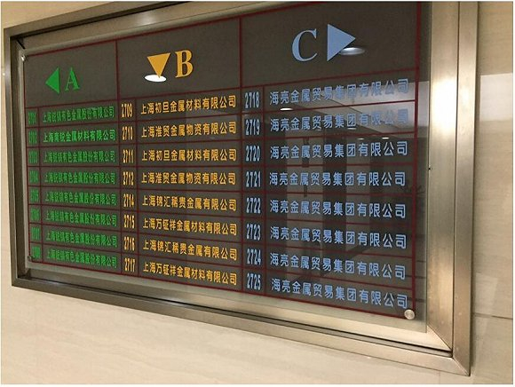 蹊跷的是,27栋走廊上的楼层指示牌上并未出现上海艾顿和上海卓泰的名字,取而代之的正是上文所提与海亮金属密切相连的上海艾顿参股公司——上海万钲祥金属材料有限公司。此外,该指示牌上还出现上文指出的上海卓泰参股公司——上海初旦金属材料有限公司。