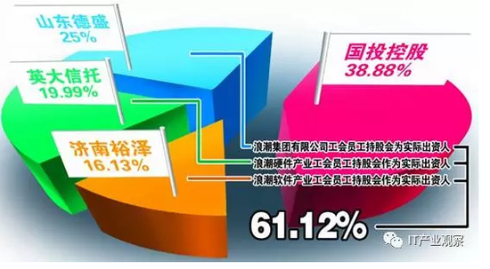 2005年12月山东省财政厅将所持剩余股权转至省国资委下属的国投控股后,形成的股权结构为:山东国投、山东德盛、英大信托、济南裕泽分别持有浪潮集团38.88%、25%、19.99%、16.13%的股权。其中,除山东省国资委控制的国投控股的38.88%,其余61.12%的股权实际控制人均为浪潮管理层。