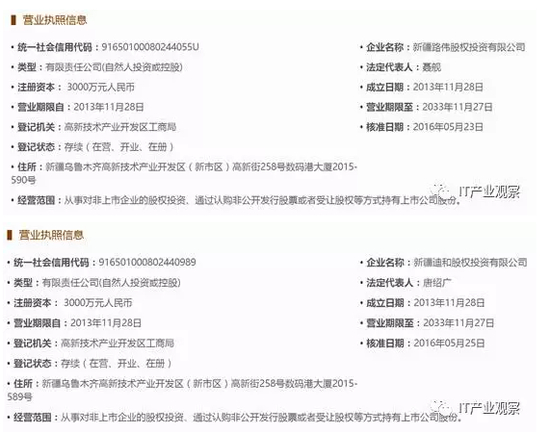 两家公司的注册日期均为2013年11月28日,住所均为新疆乌鲁木齐高新技术产业开发区(新市区)高新街258号数码港大厦,分别是2015-589号、2015-590号,这可能是某栋写字楼里相邻的两个小房间。同时,两家公司注册资本均为3000万元,股东均为两个自然人。这样两家公司分别持有了整个浪潮集团19.99%和16.13%的股权。