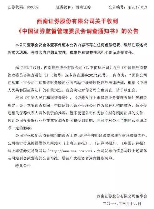 原标题:保荐业务不再连坐?NO!西南证券因“忽悠式重组”被立案调查,18个项目再遭连坐