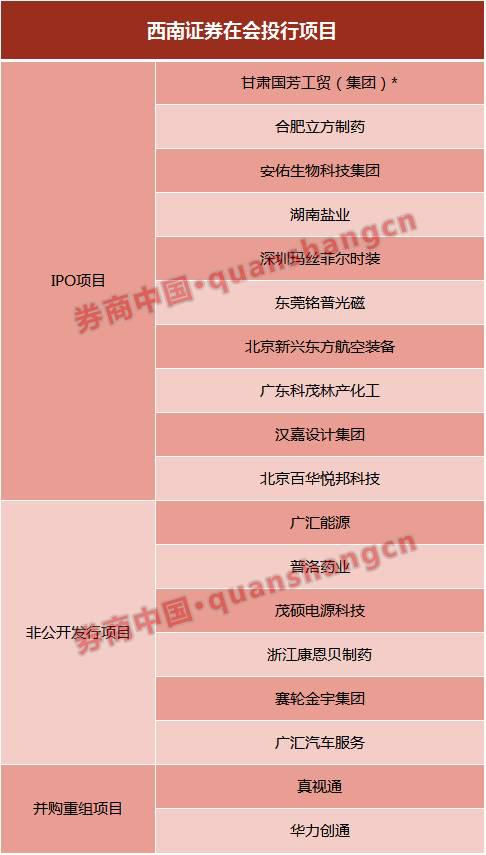 换言之,西南证券承揽的18个相关项目将遭遇连坐而被按下暂停键。据券商中国记者统计,截至证监会最新披露的数据,以保荐机构西南证券身份推荐的在会投行项目有18个,其中IPO项目10个、再融资项目6个、并购重组项目2个。