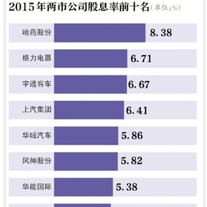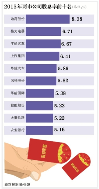 新京报记者统计发现,在2015年,除了哈药股份与格力电器,两市股息率前五的公司还有宇通客车、上汽集团、华域汽车。此外,有11家上市公司股息率在5%以上,12家公司股息率介于4%至5%之间。