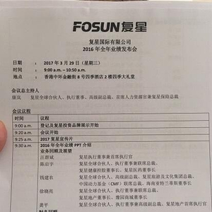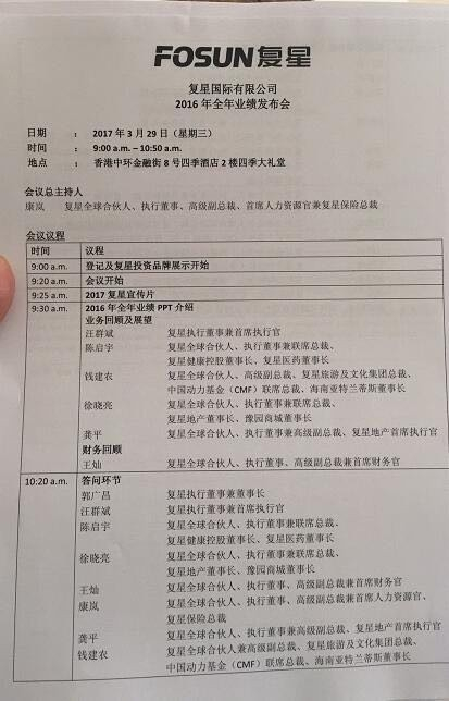 今日,复星集团召开2016年业绩发布会,有关CEO梁信军辞职的消息备受关注。从发布会议程来看,郭广昌出席将回答媒体提问。