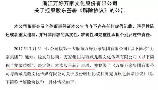 于是,龙薇传媒于3月29日与万家集团开始协商,经协商一致,双方同意终止收购交易,并在两天后签署了上述解除协议。
