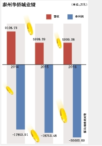 公告显示,泰州华侨城2014年营收9108.73万元,2015年降至5998万元,2016年为5999万元,两年间下滑了34%。