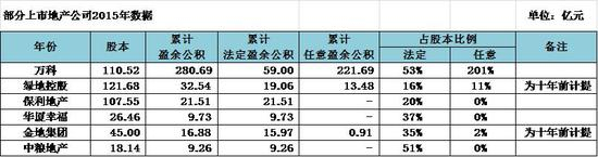 (表2:2015年房地产公司累计任意盈余公积的提取对比,多个公司为0,而万科高达股本的201%。)