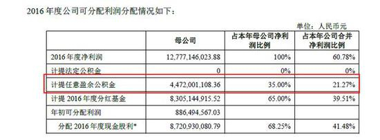 根据最新年报,万科再次以35%的大比例计提盈余公积金,提取金额为44.72亿元。截止2016年末,万科已累计计提任意盈余公积金高达266.41亿元,而同类地产上市公司在近十年就基本没有计提过任意盈余公积。
