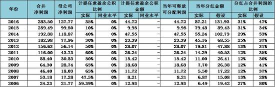 在过去的十年里,万科每年在分配现金红利前,均计提大比例的“任意盈余公积”。在2008年和2009年提取的比例高达65%,2010年提取比例为50%,2011年提取60%,2012年提取50%,2013年提取30%,2014年提取40%,2016年提取35%,只有2015年(正值宝万之争期间)提取比例降为10%。超高比例的盈余公积计提比例,明显降低了现金分红的计提基数。