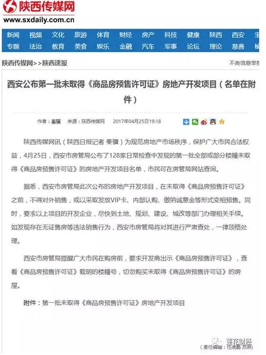 一位地产观察人士称,从“西安公布第一批未取得《商品房预售许可证》房地产开发项目”这个标题中透露的信息看,很有可能会有第二批名单……