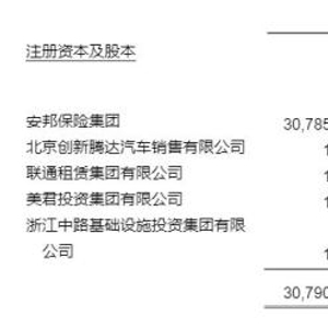 安邦人寿于2010年6月23日成立,注册资本37.9亿元。截至2016年12月31日,公司注册资本307.90亿元,其中安邦保险集团为控股股东,出资307.85亿元,持股比例为99.9838%;联通租赁集团有限公司出资125万元,持股比例0.0041%;美君投资集团有限公司出资125万元,持股比例0.0041%;浙江中路基础设施投资集团有限公司出资125万元,持股比例0.0041%;北京创新腾达汽车销售有限公司出资125万元,持股比例0.0041%。