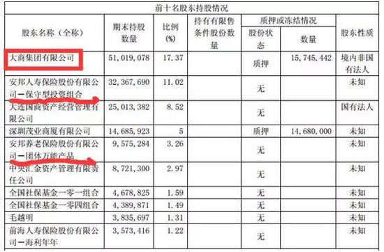 大商股份也是类似的情况,大商股份2017年一季报股东持股数据显示,大商集团有限公司持有51,019,078股,占总股本的17.37%;安邦旗下的安邦人寿保险股份有限公司-保守型投资组合持有大商股份32,367,690股,安邦养老保险股份有限公司-团体万能产品持有大商股份9,575,284股,两个产品组合合计持有大商股份41,942,974股,占总股本的14.28%。此外,大商股份也从未刊登过安邦变为大商股份第一大股东的提示性公告。从上述数据来看,目前大商股份第一大股东为大商集团,安邦目前为第二大股东。