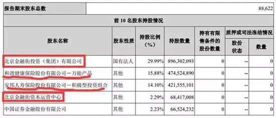 不过,从金融街披露的2017年一季报股东名单上看,北京金融街投资(集团)有限公司及其一致行动人北京金融街资本运营中心合计持有金融街964,719,101股,占总股本的32.28%,而安邦旗下的和谐健康保险股份有限公司-万能产品及安邦人寿保险股份有限公司-积极型投资组合合计持有金融街896,079,991股,占总股本的29.98%。从财报披露的股东持股比例对比来看,安邦目前仅是金融街第二大股东。