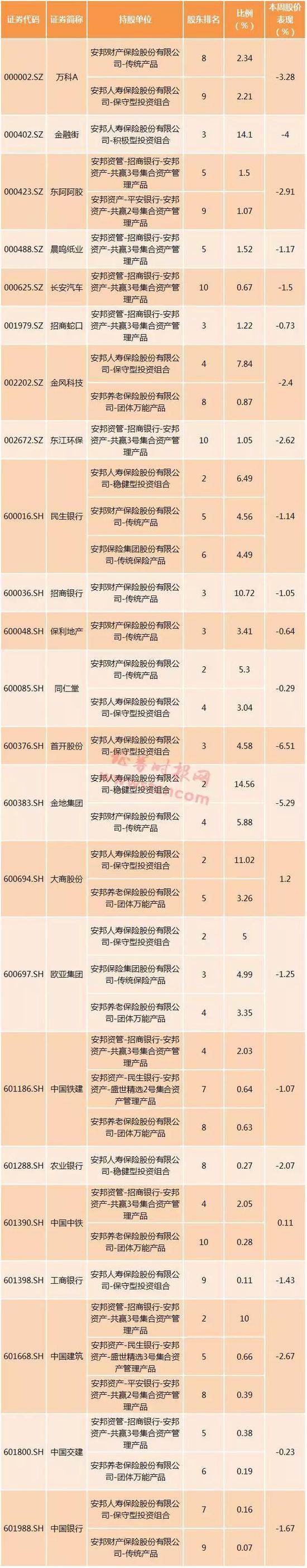 据证券时报记者不完全统计,截至一季度末,安邦现身23只个股的前十大股东名单中。其中21只个股股价本周录得下跌,其中跌幅最大的为首开股份,累计跌幅为6.51%,金地集团跌幅也超过5%,紧随其后。仅中国中铁和大商股份股价实现上涨,两者分别上涨0.11%和1.2%。