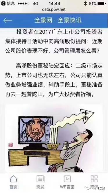 高澜股份董秘陆宏回应:二级市场走势,上市公司也无法左右,公司只能认真做业务增强业绩,辅助手段上,董秘准备再去一趟普陀山,为广大投资者祈福。