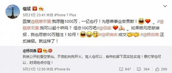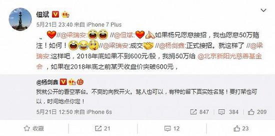 此前上海砥俊资产管理中心总经理梁瑞安在微博上称,2018年底如果贵州茅台不到600元,就捐出50万给慈善机构。私募大佬但斌随后接棒,表示愿意拿出一千万,甚至一个亿,赌贵州茅台股价在2018年年底前站上600元,“为慈善事业做贡献”。