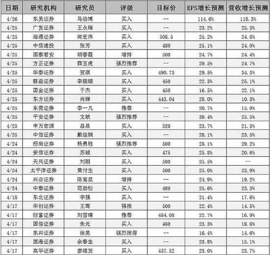32家机构中,有20家给出了贵州茅台的目标价。其中6家机构的目标价在450元或以下,已经被达到。其余的机构中,不乏预测茅台股价升至500元的券商,其中申万宏源给出的目标价最高,为520元。