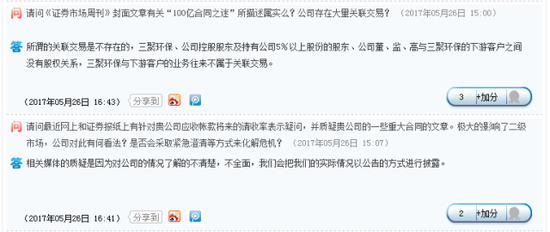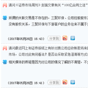 在转型为清洁能源解决方案的提供商后,三聚环保上市六年间,收入暴增41倍,净利润暴增28倍,股价实现了5年30倍的涨幅。这只明星股今日受到媒体质疑和跌停再次引起市场极大关注。之后公司在互动平台上回应称:所谓的关联交易是不存在的,三聚环保、公司控股股东及持有公司5%以上股份的股东、公司董监高与三聚环保的下游客户之间没有股权关系,三聚环保与下游客户的业务往来不属于关联交易。相关媒体的质疑是因为对公司情况了解不清楚,不全面,公司会把实际情况以公告方式进行披露。