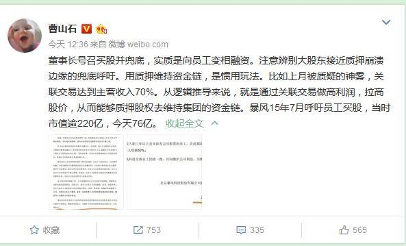 谈及多家上市公司中出现的这种兜底式员工增持倡议的现象,知名财经人士曹山石在微博称,董事长号召买股并兜底,实质是向员工变相融资。注意辨别大股东接近质押崩溃边缘的兜底呼吁。用质押维持资金链,是惯用玩法。比如上月被质疑的神雾,关联交易达到主营收入70%。从逻辑推导来说,就是通过关联交易做高利润,拉高股价,从而能够质押股权去维持集团的资金链。暴风15年7月呼吁员工买股,当时市值逾220亿,今天76亿。