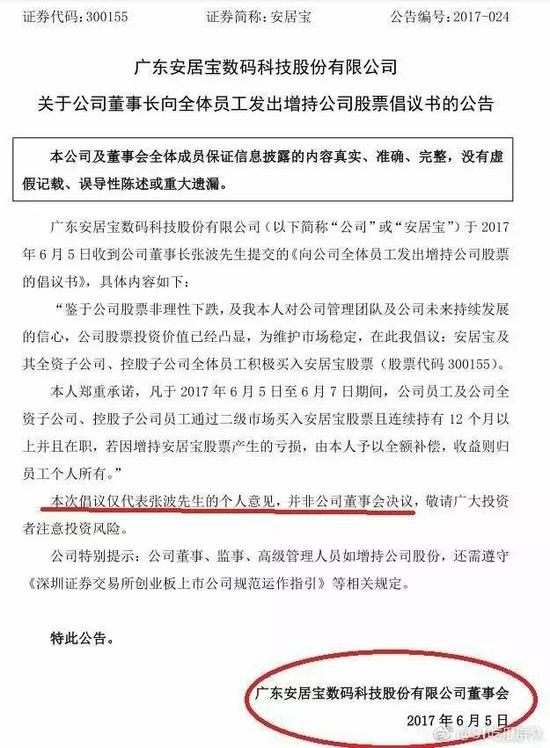 也有业内人士指出,在安居宝发出的,关于公司董事长向全体员工发出增持公司股票倡议书的公告书中指出,凡于2017年6月5日至6月7日期间,公司员工及公司全资子公司、控股子公司员工通过二级市场买入安居宝股票且连续持有12个月以上并且在职,若因增持安居宝股票产生的亏损,由本人予以全额补偿,收益则归员工个人所有。”值得一提的是,本次倡议仅代表张波先生的个人意见,并非公司董事会决议,敬请广大投资者注意投资风险。