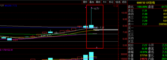 今日ST新梅以跌停价开盘,尽管日内A股普涨,沪综指涨幅更是难得的上了1%,但在盘中ST新梅丝毫没有打开跌停板的意向。截至收盘,ST新梅维持一字跌停,跌幅为4.97%,报7.27元,封单数超20万手,而今日该股的成交量仅为2017万,与昨日的3.08亿成交量相距甚远。