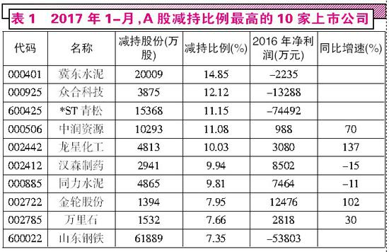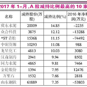 Wind数据显示,2017年以来,大股东/董监高减持比例最高的10家公司为冀东水泥、众合科技、*ST青松、中润资源、龙星化工、汉森制药、同力水泥、金轮股份、万里石和山东钢铁,其中冀东水泥、众合科技等6家上市公司2016年净利润同比下跌,或处于净亏损状态,山东钢铁、*ST青松的净亏损额更是超过5亿元。