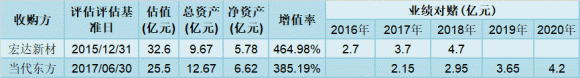 除了估值的缩水,一同下降的还有业绩承诺。2016年借壳宏达新材上市之时,原股东方承诺2016年-2018年度归属于母公司所有者净利润分别不低于为2.7亿元、3.7亿元以及4.7亿元。而此次被当代东方收购时,2017-2020年的业绩承诺分别为不低于2.15亿元、2.95亿元、3.65亿元以及4.2亿元。同样是2017年,业绩承诺就缩水了近1.6亿元。
