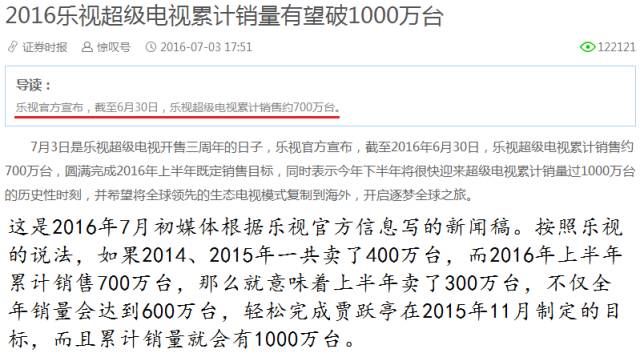 这和乐视吹嘘的2016年销售600万台,差得实在太远了。