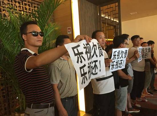 所以在经过若干轮表决、通过所有这些决议之后,临时股东大会十五分钟就结束了。与此同时,会场外有无数举着“乐视还钱”标语的讨债人,如果不是警察阻拦,估计他们早就闯入会场了。本来这场会议的原定召开时间是下午两点,但由于会场签到台已经被供应商”攻破”,22位来自全国各地的手机供应商推翻签到桌,围堵会议现场,要求面见乐视创始人贾跃亭。