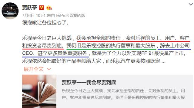 几乎与此同时,贾跃亭在美国发表了“我会尽责到底”的微博,里面的内容如下。
