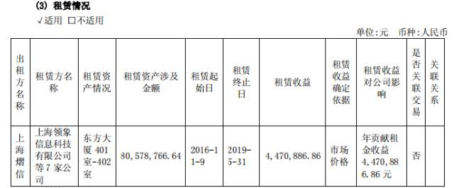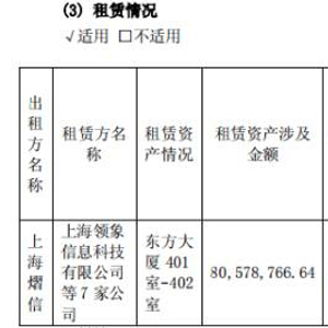 半年报显示,租赁方上海领象信息科技有限公司(下简称“领象信息”)等7家公司年贡献租金收益超过447万元。领象信息的股东是上海育创网络科技股份有限公司,旗下拥有O2O教育品牌北风教育,并非前述医疗行业相关的融资租赁业务。