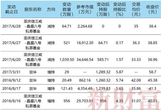 2017年6月20-28日,景华称重庆信三威昌盛8号由于面临到期清算,其所持股权通过大宗交易的方式转给了韩宝琴、宋昭君、王丽丽、王伟等人,同时景华还与后者结成了“一致行动人”关系。