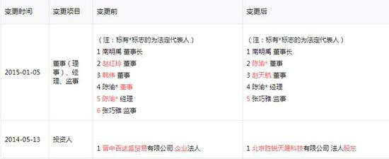 北京天尧主要业务为银行信用卡消费服务。2014年5月,北京天尧的股东发生变更,由晋中百达盛贸易有限公司(简称“晋中百达盛”)变成了北京胜锐天晟科技有限公司(表14,注意看截图,尽管北京天尧的股东多次变化,但其高管团队相对稳定,比如,南明禹在2017年5月前都一直长期担任北京天尧的董事长)。