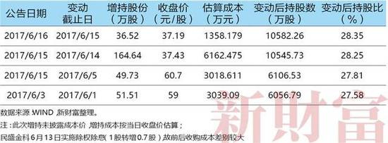 2017年5月24日,天津柚子更名为“和柚技术集团有限公司”,并在6月1日、5日、14、15日多次增持民盛金科股份,合计增持302.4万股,成本估算约1.36亿元(表10)。此轮增持后,和柚技术持有民盛金科28.35%股权,累计成本约17.56亿元。按照2017年7月21日的收盘价37.13元/股计算,民盛金科的市值达到了138.6亿元,郝江波的和柚技术所持股份价值约39.3亿元,相较17.56亿元的总投资成本,账面浮盈超过了21亿元!