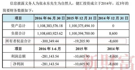 收购宏磊股份之时,健汇投资处于资不抵债的境况中。数据显示,其2015年末的资产和负债都是11亿元,净资产为-1.92万元。就是这么一家刚成立、净资产为负的公司,一口气拿出了11亿元,投资入股成了宏磊股份的二股东。而2016半年报显示,其净资产、净利润仍为负(表5)。