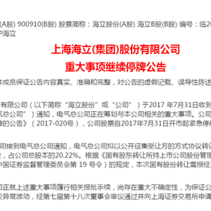 新浪财经讯 8月6日消息,上海海立(集团)股份有限公司(以下简称“海立股份”或“公司”)于2017 年7月31日收到控股股东上海电气(集团)总公司(以下简称“电气总公司”)通知,电气总公司正在筹划与本公司相关的重大事项。公司于2017年8月1日发布《关于公司股票实施停牌的公告》(2017-020号),公司股票自2017年7月31日开市起紧急停牌,并自8月1日起连续停牌。