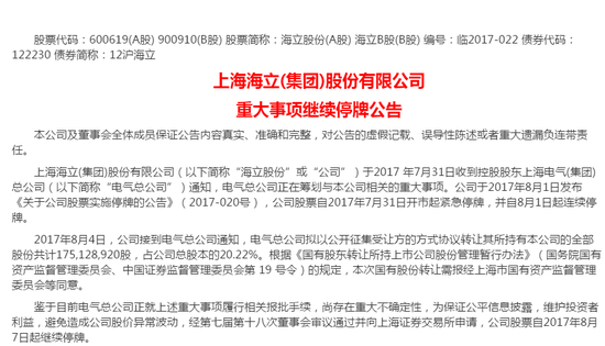 鉴于目前电气总公司正就上述重大事项履行相关报批手续,尚存在重大不确定性,为保证公平信息披露,维护投资者利益,避免造成公司股价异常波动,经第七届第十八次董事会审议通过并向上海证券交易所申请,公司股票自2017年8月7日起继续停牌。
