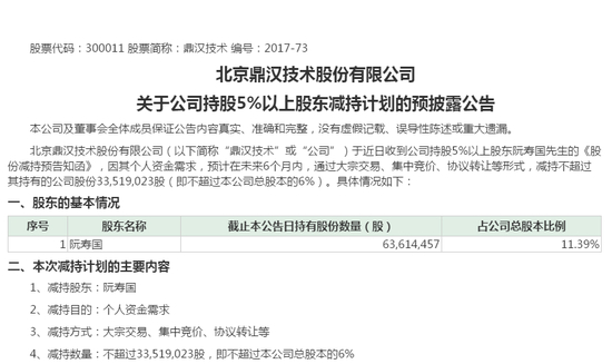 新浪财经讯 鼎汉技术发布公告,鼎汉技术股东阮寿国(持有公司11.39%的股份)预计在未来6个月内,通过大宗交易、集中竞价、协议转让等形式,减持公司股份不超3352万股(即不超总股本的6%)。阮寿国所持股份为公司因重大资产重组及配套募集资金向其非公开发行的股份。