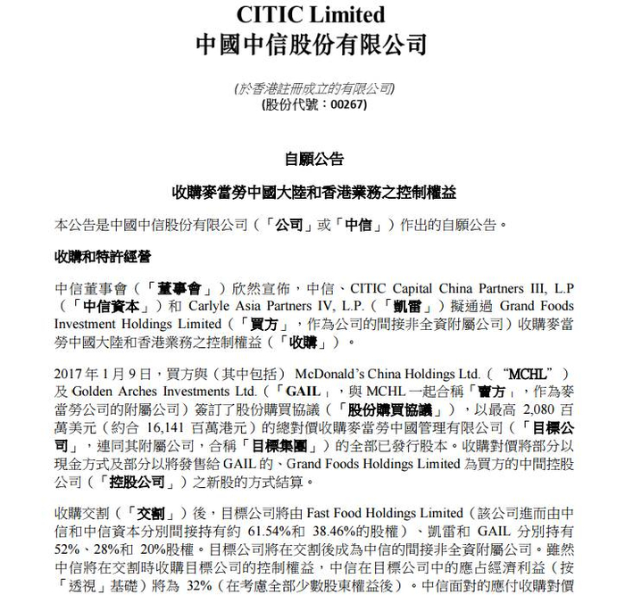 据中信股份1月的公告显示,交割之后,麦当劳中国将由Fast Food Holdings Limited(该公司由中信股份和中信资本分別间接持有约 61.54%和 38.46%的股权)、凯雷和麦当劳分别持有 52%、28%和 20%股权。