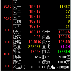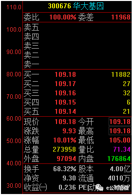 华大基因果然不负众望,上市之后一口气展开了18个一字涨停之旅。就在今日,华大基因仍以涨停价开盘,很快便有大量抛单涌现,进入集合竞价时段几分钟后,首次打开了一字涨停板,但不久后再次封停。收出一个“T”字,这也是该股上市以来的第19个涨停板。今日该股股价冲破百元,收盘报109.18元,约为发行价13.64元的8倍。