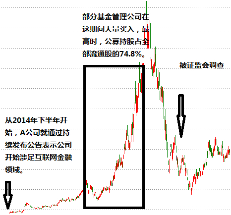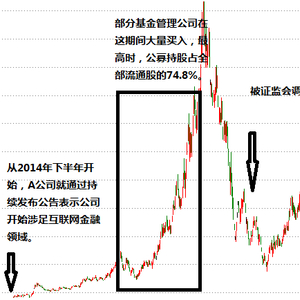 与此同时,频频接待机构投资者调研,描绘公司互金业务的蓝图,部分机构投资者闻风起舞通过研报等方式大肆吹捧。公司就这样蹭上了互联网金融的热点,一时间成为了资本市场上的香饽饽,股价扶摇直上,涨幅达十几倍。