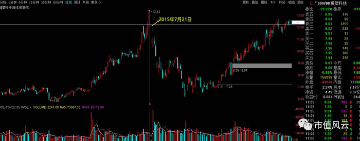 先说一下特殊情况,模塑科技停牌是在2015年4月,复牌在2015年7月。4月份,牛市已经开始进入尾声,7月份市场已经经历了股灾1.0。当时股价是这样的: