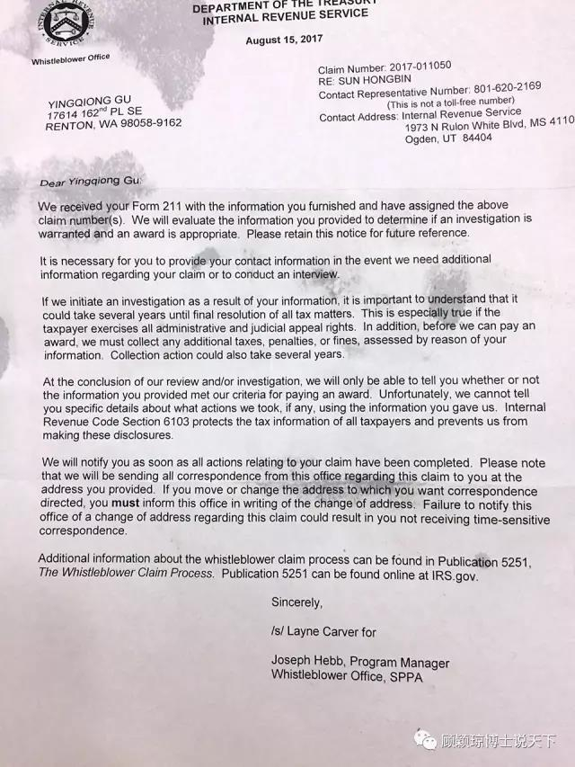9月3日,微信公号“顾颖琼博士说天下”发文称已经向美国联邦税务局和美国联邦调查局寄去检举表格,并于8月30日收到官方回信。信件中称,美国联邦税务局将评估提供的信息,以进行立案调查,但是调查过程可能要花费好几年。顾颖琼称,这封0.49美元(人民币3元)的检举信最高会为他带来2000万美金(约合人民币1.3亿元)的奖励。