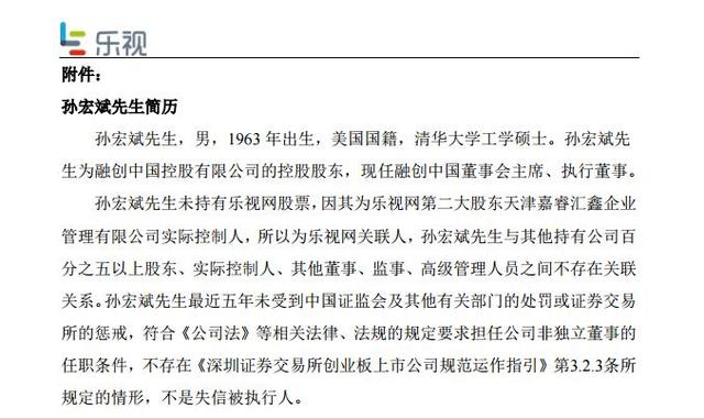 乐视网此前公告显示,孙宏斌为美国国籍。